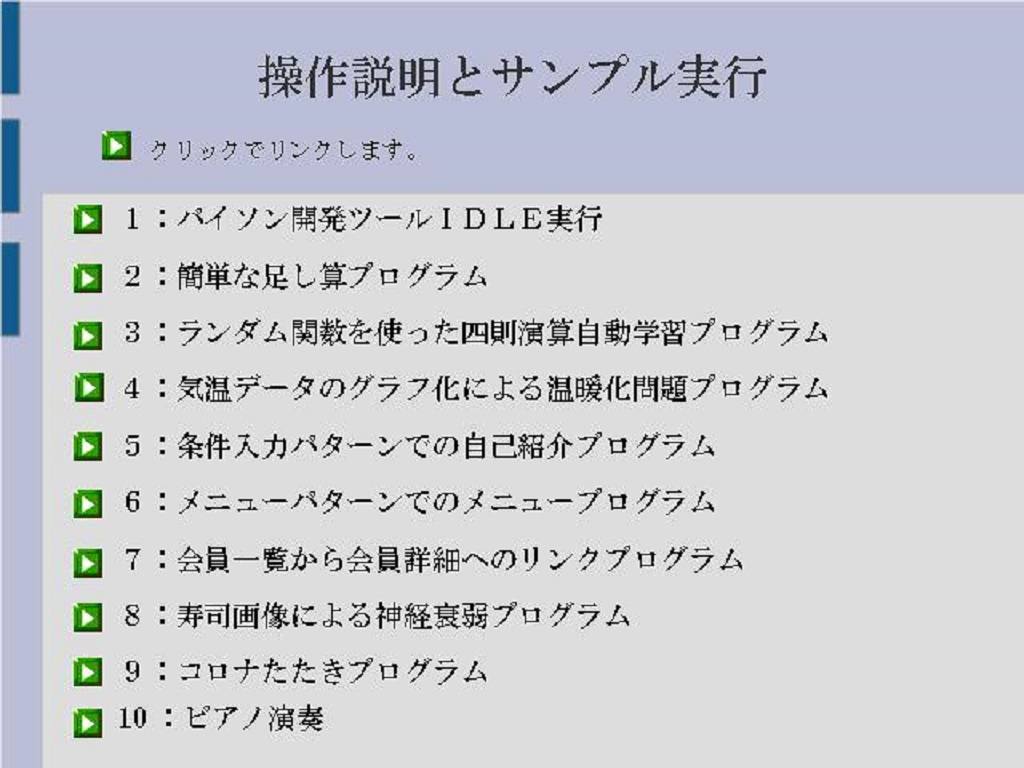 メニュー 会員一覧 自動四則演算 足し算 気温グラフ 自己紹介 IDLE操作 寿司神経衰弱 コロナたたき ピアノ演奏